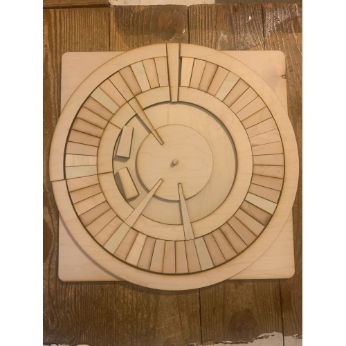 Built as described above, except that Christmas ends before sinking into the center circle so you can easily shift the space between Christmas and Easter, move the Sunday pieces of Ordinary Time to fill in the space. In this way the wood arrows and center circle serve double duty. It also includes discs for the seasons and the full moons.
